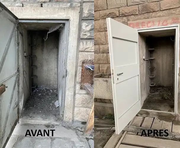 L’intervention a consisté à démonter les anciennes structures, évacuer les éléments usés puis fabriquer à neuf des portes sur mesure, adaptées aux dimensions existantes.